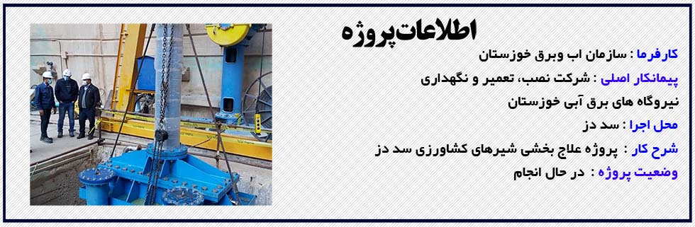 پایان عملیات بهینه سازی و افزایش ظرفیت ترانسفورماتور قدرت واحد شماره یک نیروگاه سد دز : مدیر عامل شرکت نصب، تعمیر و نگهداری نیروگاه‌های برق‌آبی خوزستان از باز طراحی و ارتقای ظرفیت ترانسفورماتور قدرت واحد شماره یک نیروگاه دز و نصب و راه اندازی آن با موفقیت خبر داد. | تعمیر و بازسازی اویل کولر اپربراکت نیروگاه سد کارون ۳ : مدیر کارگاه پمپ و شیرآلات شرکت نصب، تعمیر و نگهداری نیروگاه‌های برق‌آبی خوزستان از انجام عملیات تعمیر و بازسازی یک دستگاه اویل کولر مربوط به اپربراکت نیروگاه سد کارون ۳ خبر داد | پایان عملیات تراشکاری محفظه توربین ( Turbine Pit ) واحد شماره ۵ نیروگاه سد دز : مدیر پروژه بهینه‌سازی نیروگاه سد دز در شرکت نصب، تعمیر و نگهداری نیروگاه‌های برق‌آبی خوزستان از پایان موفقیت‌آمیز عملیات تراشکاری محفظه توربین ( Turbine Pit ) واحد شماره ۵ نیروگاه سد دز خبر داد. | عملیات دمونتاژ شفت ژنراتور ولاوربراکت واحد شماره ۲ نیروگاه مارون بهبهان با موفقیت انجام شد : معاون فنی و مهندسی در شرکت نصب، تعمیر و نگهداری نیروگاه‌های برق‌آبی خوزستان از خارج نمودن مجموعه شفت ژنراتور و لاور براکت واحد شماره ۲ نیروگاه مارون بهبهان خبر داد . | عملیات شستشوی سیم پیچ ژنراتور واحد شماره 4 نیروگاه سد دز : مدیر تعمیرات ناحیه دز در شرکت نصب، تعمیر و نگهداری نیروگاه‌های برق‌آبی خوزستان از انجام موفق عملیات شستشوی سیم پیچ ژنراتور واحد شماره 4 نیروگاه سد دز خبر داد. |