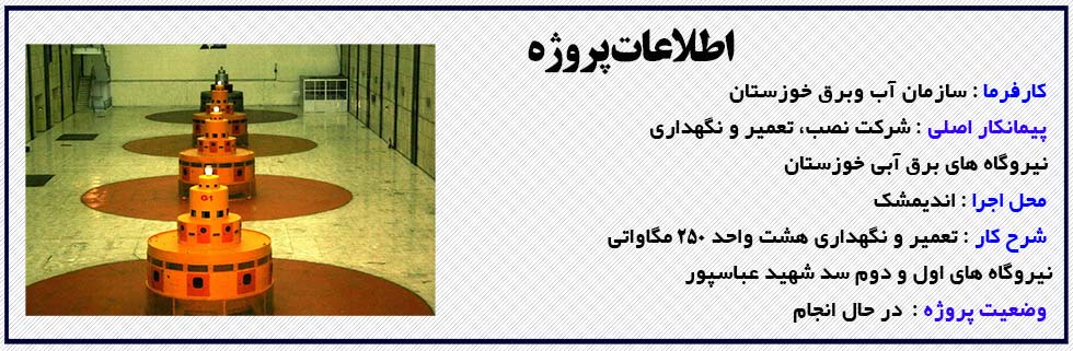 پایان عملیات بهینه سازی و افزایش ظرفیت ترانسفورماتور قدرت واحد شماره یک نیروگاه سد دز : مدیر عامل شرکت نصب، تعمیر و نگهداری نیروگاه‌های برق‌آبی خوزستان از باز طراحی و ارتقای ظرفیت ترانسفورماتور قدرت واحد شماره یک نیروگاه دز و نصب و راه اندازی آن با موفقیت خبر داد. | تعمیر و بازسازی اویل کولر اپربراکت نیروگاه سد کارون ۳ : مدیر کارگاه پمپ و شیرآلات شرکت نصب، تعمیر و نگهداری نیروگاه‌های برق‌آبی خوزستان از انجام عملیات تعمیر و بازسازی یک دستگاه اویل کولر مربوط به اپربراکت نیروگاه سد کارون ۳ خبر داد | پایان عملیات تراشکاری محفظه توربین ( Turbine Pit ) واحد شماره ۵ نیروگاه سد دز : مدیر پروژه بهینه‌سازی نیروگاه سد دز در شرکت نصب، تعمیر و نگهداری نیروگاه‌های برق‌آبی خوزستان از پایان موفقیت‌آمیز عملیات تراشکاری محفظه توربین ( Turbine Pit ) واحد شماره ۵ نیروگاه سد دز خبر داد. | عملیات دمونتاژ شفت ژنراتور ولاوربراکت واحد شماره ۲ نیروگاه مارون بهبهان با موفقیت انجام شد : معاون فنی و مهندسی در شرکت نصب، تعمیر و نگهداری نیروگاه‌های برق‌آبی خوزستان از خارج نمودن مجموعه شفت ژنراتور و لاور براکت واحد شماره ۲ نیروگاه مارون بهبهان خبر داد . | عملیات شستشوی سیم پیچ ژنراتور واحد شماره 4 نیروگاه سد دز : مدیر تعمیرات ناحیه دز در شرکت نصب، تعمیر و نگهداری نیروگاه‌های برق‌آبی خوزستان از انجام موفق عملیات شستشوی سیم پیچ ژنراتور واحد شماره 4 نیروگاه سد دز خبر داد. |