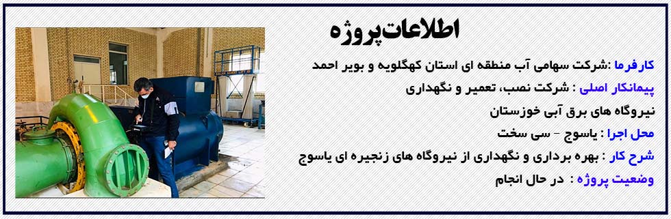 پایان عملیات بهینه سازی و افزایش ظرفیت ترانسفورماتور قدرت واحد شماره یک نیروگاه سد دز : مدیر عامل شرکت نصب، تعمیر و نگهداری نیروگاه‌های برق‌آبی خوزستان از باز طراحی و ارتقای ظرفیت ترانسفورماتور قدرت واحد شماره یک نیروگاه دز و نصب و راه اندازی آن با موفقیت خبر داد. | تعمیر و بازسازی اویل کولر اپربراکت نیروگاه سد کارون ۳ : مدیر کارگاه پمپ و شیرآلات شرکت نصب، تعمیر و نگهداری نیروگاه‌های برق‌آبی خوزستان از انجام عملیات تعمیر و بازسازی یک دستگاه اویل کولر مربوط به اپربراکت نیروگاه سد کارون ۳ خبر داد | پایان عملیات تراشکاری محفظه توربین ( Turbine Pit ) واحد شماره ۵ نیروگاه سد دز : مدیر پروژه بهینه‌سازی نیروگاه سد دز در شرکت نصب، تعمیر و نگهداری نیروگاه‌های برق‌آبی خوزستان از پایان موفقیت‌آمیز عملیات تراشکاری محفظه توربین ( Turbine Pit ) واحد شماره ۵ نیروگاه سد دز خبر داد. | عملیات دمونتاژ شفت ژنراتور ولاوربراکت واحد شماره ۲ نیروگاه مارون بهبهان با موفقیت انجام شد : معاون فنی و مهندسی در شرکت نصب، تعمیر و نگهداری نیروگاه‌های برق‌آبی خوزستان از خارج نمودن مجموعه شفت ژنراتور و لاور براکت واحد شماره ۲ نیروگاه مارون بهبهان خبر داد . | عملیات شستشوی سیم پیچ ژنراتور واحد شماره 4 نیروگاه سد دز : مدیر تعمیرات ناحیه دز در شرکت نصب، تعمیر و نگهداری نیروگاه‌های برق‌آبی خوزستان از انجام موفق عملیات شستشوی سیم پیچ ژنراتور واحد شماره 4 نیروگاه سد دز خبر داد. |