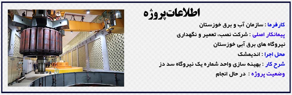 پایان عملیات بهینه سازی و افزایش ظرفیت ترانسفورماتور قدرت واحد شماره یک نیروگاه سد دز : مدیر عامل شرکت نصب، تعمیر و نگهداری نیروگاه‌های برق‌آبی خوزستان از باز طراحی و ارتقای ظرفیت ترانسفورماتور قدرت واحد شماره یک نیروگاه دز و نصب و راه اندازی آن با موفقیت خبر داد. | تعمیر و بازسازی اویل کولر اپربراکت نیروگاه سد کارون ۳ : مدیر کارگاه پمپ و شیرآلات شرکت نصب، تعمیر و نگهداری نیروگاه‌های برق‌آبی خوزستان از انجام عملیات تعمیر و بازسازی یک دستگاه اویل کولر مربوط به اپربراکت نیروگاه سد کارون ۳ خبر داد | پایان عملیات تراشکاری محفظه توربین ( Turbine Pit ) واحد شماره ۵ نیروگاه سد دز : مدیر پروژه بهینه‌سازی نیروگاه سد دز در شرکت نصب، تعمیر و نگهداری نیروگاه‌های برق‌آبی خوزستان از پایان موفقیت‌آمیز عملیات تراشکاری محفظه توربین ( Turbine Pit ) واحد شماره ۵ نیروگاه سد دز خبر داد. | عملیات دمونتاژ شفت ژنراتور ولاوربراکت واحد شماره ۲ نیروگاه مارون بهبهان با موفقیت انجام شد : معاون فنی و مهندسی در شرکت نصب، تعمیر و نگهداری نیروگاه‌های برق‌آبی خوزستان از خارج نمودن مجموعه شفت ژنراتور و لاور براکت واحد شماره ۲ نیروگاه مارون بهبهان خبر داد . | عملیات شستشوی سیم پیچ ژنراتور واحد شماره 4 نیروگاه سد دز : مدیر تعمیرات ناحیه دز در شرکت نصب، تعمیر و نگهداری نیروگاه‌های برق‌آبی خوزستان از انجام موفق عملیات شستشوی سیم پیچ ژنراتور واحد شماره 4 نیروگاه سد دز خبر داد. |
