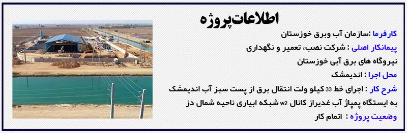 پایان عملیات بهینه سازی و افزایش ظرفیت ترانسفورماتور قدرت واحد شماره یک نیروگاه سد دز : مدیر عامل شرکت نصب، تعمیر و نگهداری نیروگاه‌های برق‌آبی خوزستان از باز طراحی و ارتقای ظرفیت ترانسفورماتور قدرت واحد شماره یک نیروگاه دز و نصب و راه اندازی آن با موفقیت خبر داد. | تعمیر و بازسازی اویل کولر اپربراکت نیروگاه سد کارون ۳ : مدیر کارگاه پمپ و شیرآلات شرکت نصب، تعمیر و نگهداری نیروگاه‌های برق‌آبی خوزستان از انجام عملیات تعمیر و بازسازی یک دستگاه اویل کولر مربوط به اپربراکت نیروگاه سد کارون ۳ خبر داد | پایان عملیات تراشکاری محفظه توربین ( Turbine Pit ) واحد شماره ۵ نیروگاه سد دز : مدیر پروژه بهینه‌سازی نیروگاه سد دز در شرکت نصب، تعمیر و نگهداری نیروگاه‌های برق‌آبی خوزستان از پایان موفقیت‌آمیز عملیات تراشکاری محفظه توربین ( Turbine Pit ) واحد شماره ۵ نیروگاه سد دز خبر داد. | عملیات دمونتاژ شفت ژنراتور ولاوربراکت واحد شماره ۲ نیروگاه مارون بهبهان با موفقیت انجام شد : معاون فنی و مهندسی در شرکت نصب، تعمیر و نگهداری نیروگاه‌های برق‌آبی خوزستان از خارج نمودن مجموعه شفت ژنراتور و لاور براکت واحد شماره ۲ نیروگاه مارون بهبهان خبر داد . | عملیات شستشوی سیم پیچ ژنراتور واحد شماره 4 نیروگاه سد دز : مدیر تعمیرات ناحیه دز در شرکت نصب، تعمیر و نگهداری نیروگاه‌های برق‌آبی خوزستان از انجام موفق عملیات شستشوی سیم پیچ ژنراتور واحد شماره 4 نیروگاه سد دز خبر داد. |